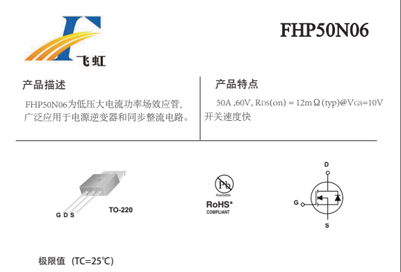 FHP50N06的主要封裝形式是TO-220、TO-252、TO-263三種,60V低壓MOS管50N06腳位排列位GDS。這款50N06場效應管產品具體參數:Vgs(±V):25;VTH(V):2-4;ID(A):50;BVdss(V):60。RDS (on) = 12mΩ(typ)@V GS =10V。內阻低,溫升低的特點。